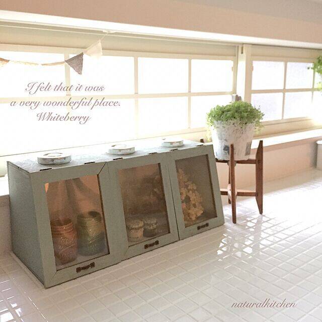 Whiteberryさんのキッチンには3連の上開きタイプのショーケースが置かれていました。優しげなグリーンカラーが爽やかな白タイルのキッチンに映えていて、目が留まりますよね。ご自身の好きな色でペイントされたのだそうです♡ヴィンテージ風な取っ手もとてもかわいらしいです。