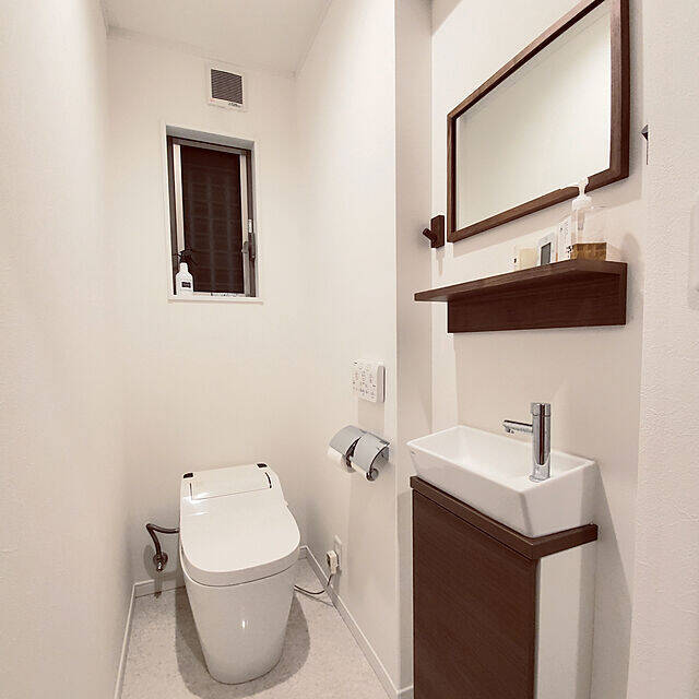 blue-3さんは、トイレに無印良品のウォールナット材のL字棚を取り付けています。鏡も同じく無印良品のウォールナット素材のものだそうです。備え付けの手洗い収納の扉の色と合っていて、元からセットだったかのようですね。見た目の美しさはもちろん、手洗い場の機能性もアップして一石二鳥です。
