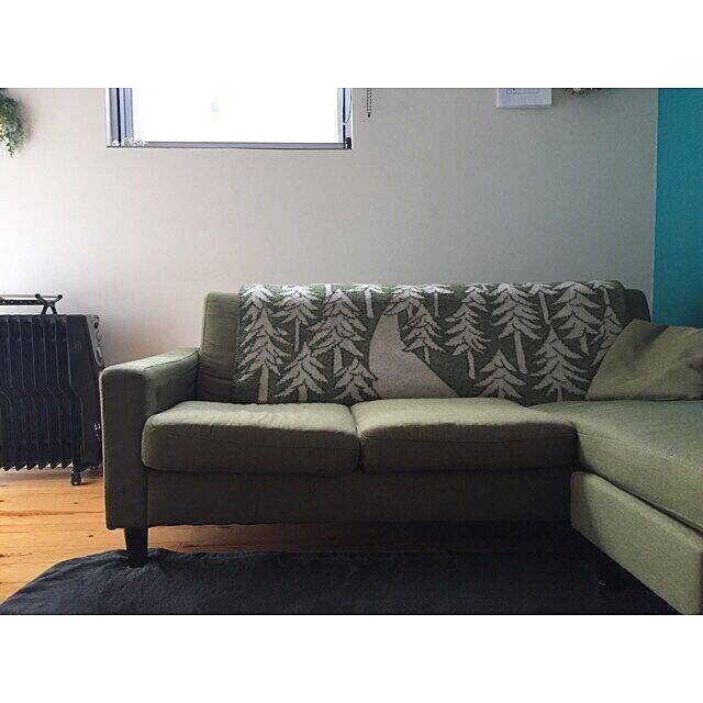 ayaさんのソファには、ミナペルホネンのブランケットが掛けられていました。森を連想させるデザインが、シンプルなソファに温もりと彩りを与えてくれます。寒い時期が終わっても片付けたくないというコメントに、このブランケットの魅力が詰まっていますね。ソファと同系色を選ぶカラーバランスもお上手です。