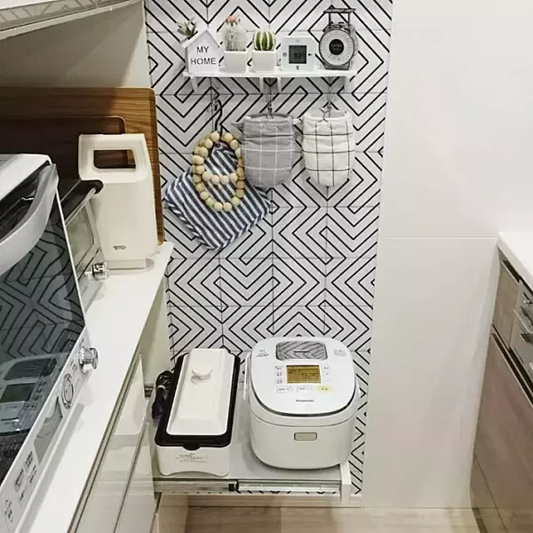 今ある収納スペースを最大限に活かしたアイデアです。背面の収納棚についている引き出せるタイプの炊飯器置き場の奥のスペースを、ホットプレートの置き場所にしているんだそうです。ご飯を炊くときも邪魔にならず、使いたいときはスムーズに取り出せます。棚を中に入れてしまえば、すっきり整うのもいいですね。