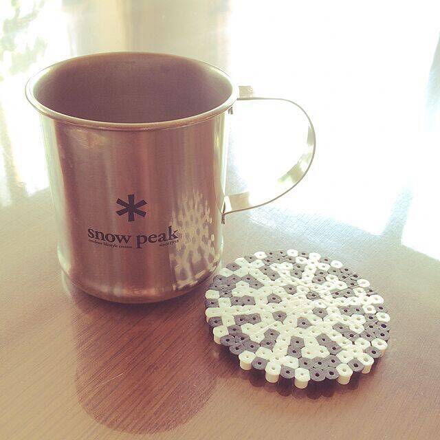 アウトドアでも扱いやすいステンレスのマグカップは、お家の中でも存在感を放ちます。ユーザーさんが使用しているロゴ入りマグカップは、snow peakならではのシンプルなデザインです。かわいいコースターと合わせると、ティータイムが楽しくなりますね♪