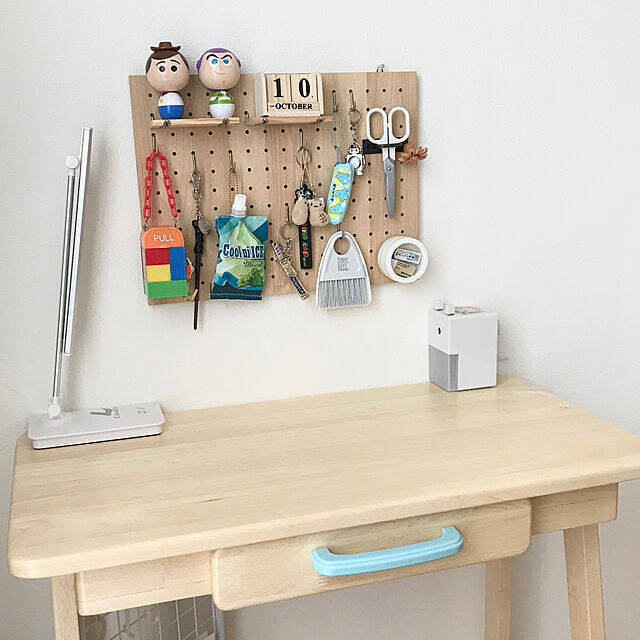 お子さんのデスク前の壁に、ダイソーの有孔ボードを取り付けられているというtakubonchanさん。お気に入りのアイテムや、ハサミやホウキなどの道具を設置されています。デスクの上がスッキリ片付いていて、とても気持ちがいいですね。