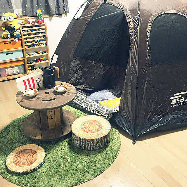 子ども部屋にテントを広げたら、キャンプごっこも楽しくなります。お家テントをやってみたかったというユーザーさんは、ニトリのグリーンのラグと切り株クッションで、キャンプの雰囲気を感じさせるコーディネートをつくられています。ケーブルドラムがいい味を出してますね。