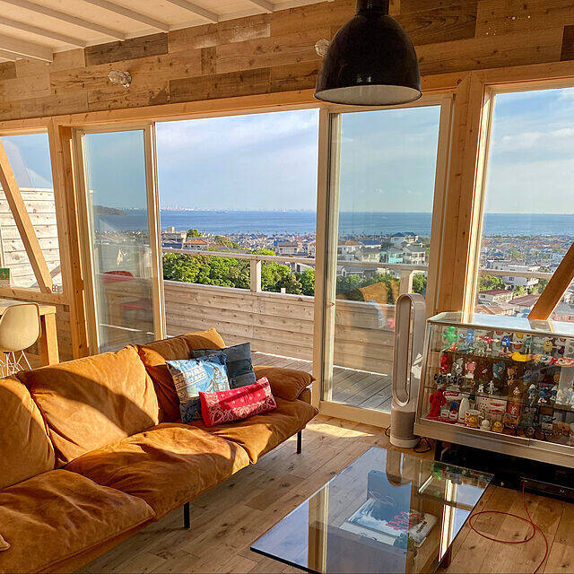木の温もりに包まれたbuhi-houseさんのお部屋は、海が見えるロケーションとウッドデッキの相乗効果でリゾートのように開放的です♪こなれた雰囲気を醸し出すTRUCK FURNITUREのソファは細めの脚で抜け感があり、ガラステーブルで軽やかさも演出。アメリカン雑貨を飾ることで遊び心も効いています。