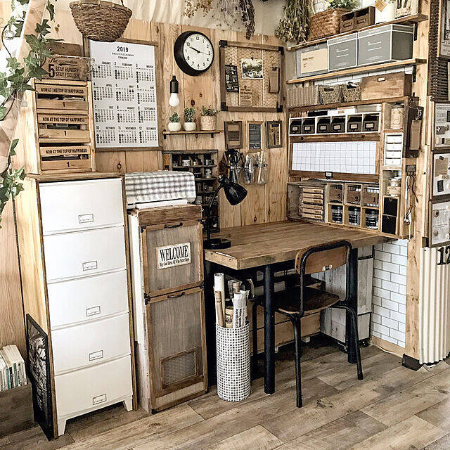 ナチュラル要素のある男前インテリアがお好みの方は、「デスク(N ステイン 120)」がおすすめです。4kidsmamaさんはこちらのブラウンを、同じシリーズのシェルフとともに使っています。インダストリアルな雰囲気が、カッコいい書斎スペースを演出していますね。アジャスター付きで、がたつきの調整も可能です。