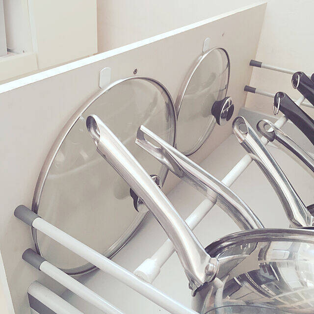 こちらのユーザーさんは、コンロの横にラックを置いてフライパンの蓋を収納しています。壁を傷つけること無くフライパンの蓋を収納しておけるのがうれしいですね。調理中にも手に届きやすいナイスポジションです。