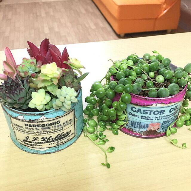 空き缶と植物は、とても相性がいいですよね。空き缶を植物のプランターに活用されている方が、多くいらっしゃいました。年月が経ってサビ感が出ても素敵なので、インテリアとして長く鑑賞できそうです。