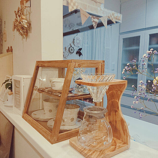 美しい木目が目を引くこちらは、ハリオのコーヒードリッパーです。オリーブウッドのコーヒースタンドに、クリアのドリッパーとサーバーがなじんでいますね。ナチュラルな雰囲気のキッチンカウンターにぴったりです。