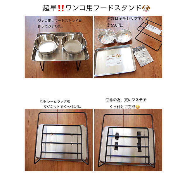 knkさんは、100均リメイクで犬用のごはん台を作っています。マグネットで固定して作るやり方で、材料はすべてセリアでそろえて合計550円だったとのこと。10分どころか、3分もかからずに作れそうなくらい簡単にできたそうです。