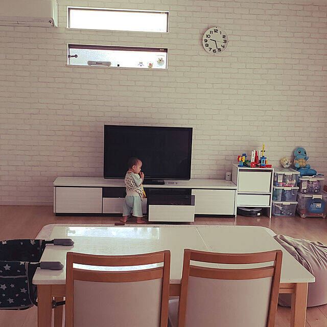 s-myhomeさんのリビングは、テレビ台横の一角がお子さんのおもちゃスペースになっています。白いカラーボックスの一番下に、ルンバの基地がありますね。カラーボックスの幅も高さも、ルンバのサイズにピッタリ。お子さんが長くすごす場所にルンバの基地があると、掃除がしやすく安心です。
