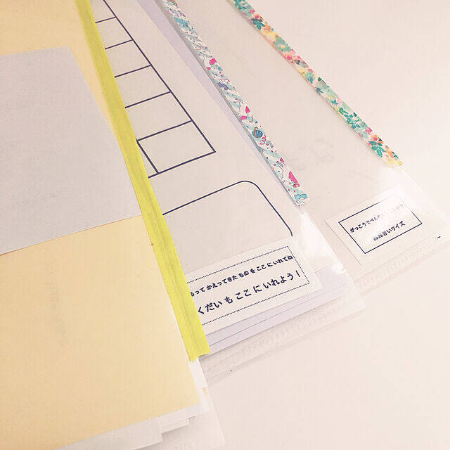 書類の整理にクリアファイルを使っているユーザーさん。クリアファイルの背中側にはマスキングテープを貼って、わかりやすく工夫しています。ちょっぴりマスキングテープがはみ出すように貼るのが、より見やすくなるコツだそうです。