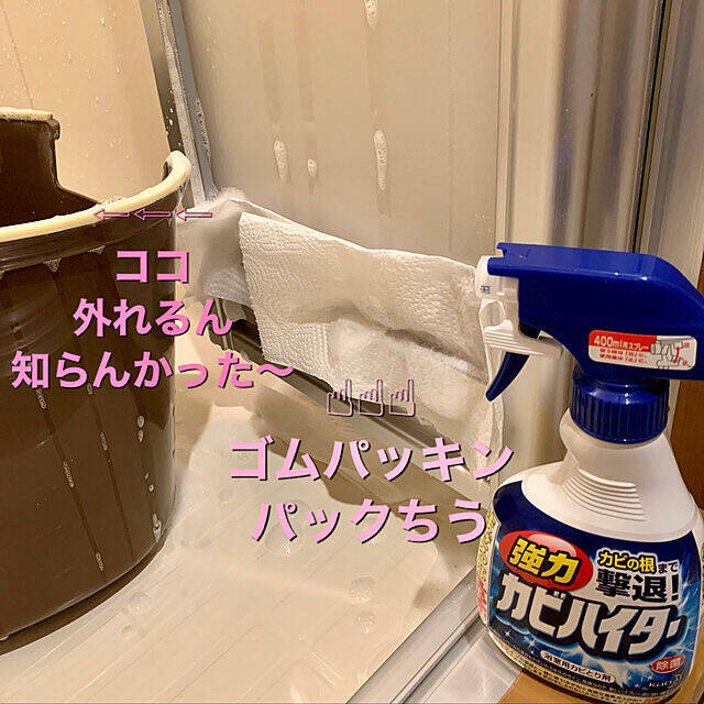 yasuyo66さんは強力カビハイターを使って、風呂扉とイスのゴムパッキンのカビ取りをされています。キッチンペーパーでパックして、しっかり浸透させることがポイント!カビが消えて真っ白になったそうですよ。