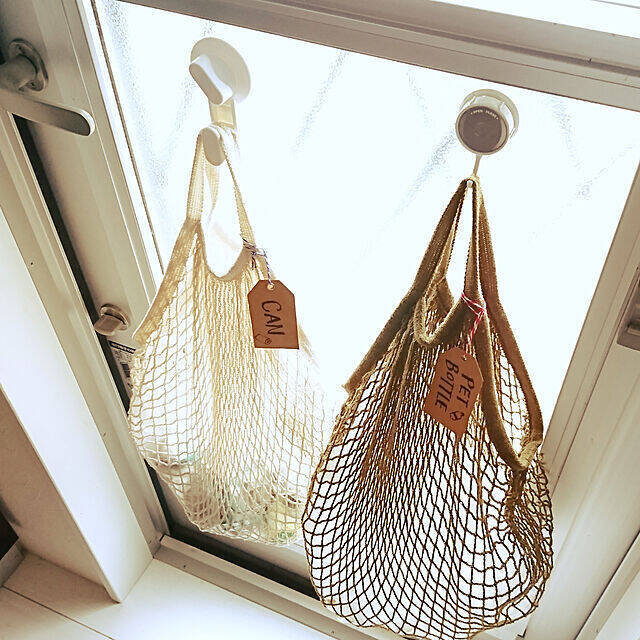 勝手口の扉がある場所は、物を置けないのでスペース的にはちょっともったいないですよね。mmmさんは、扉のガラス面に100円均一のネットバッグを吸盤で吊り下げ、ペットボトルと缶を保管されています。洗って乾かせばさっと捨てられ、勝手口からの出入りも邪魔にならず一石二鳥ですね。