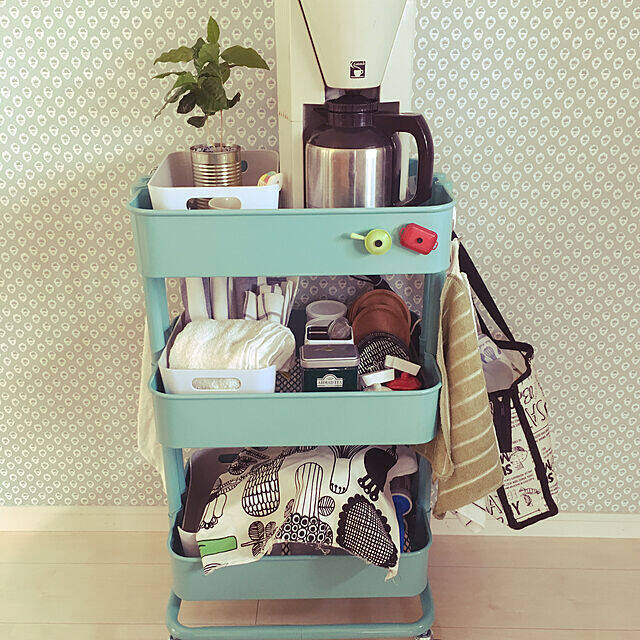 IKEAのターコイズカラーの3段ワゴンを活用されているのはAmiさんです。コーヒーメーカーやコースター・キッチンクロスを中心にまとまっている、使いやすそうなワゴンですね。上の段にはなんとコーヒーの木が♪お家カフェ気分が盛り上がります。3段目のようにかわいいクロスでカバーリングをする工夫もいいですね。