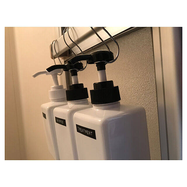 無印良品の「横ブレしにくいフック」を、シャンプーボトルの収納に活用されています。二重構造のフックに、ボトルのネック部分がぴったりフィットしています。バーに引っ掛けたままでもポンプを押すことができ、便利だそうですよ。