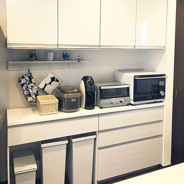 家電製品がスッキリと並べられたこちらのキッチン。nagi-wさんは、その横に置いた無印良品のブリ材バスケットにお子さんのお薬を入れられているそうです。あかるい色味のブリ材バスケットが、ホワイトのキッチンになじんでいますね。