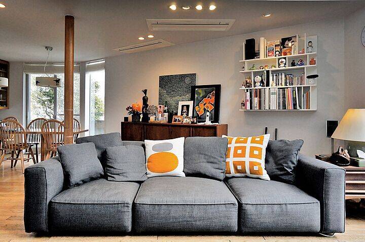 「まだ小学生の息子がいたので、生地選びはデザインだけではなく、耐久性や汚れの目立たなさといった機能性と両立させる必要がありました。そこで、色はある程度の濃さがあり単色で織られていないもの、糸は太目でざっくり織られているカジュアルなものから選定。これに撥水加工をオプションで施しました。まだ使用開始して1年なので、気になる汚れやクッションのヘタレなどは全くありません。」