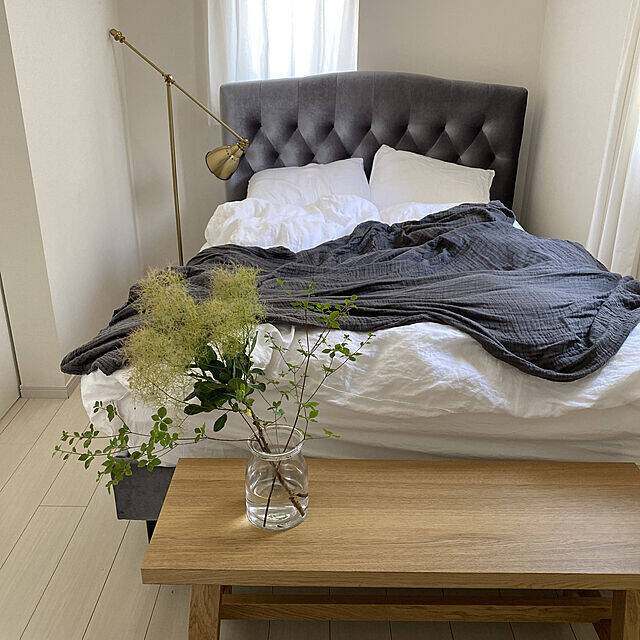北欧モダンなベッド周りを実現させているユーザーさん。モノトーンでまとめられており、大人っぽい雰囲気ですね。ベッドの足下にベンチを置いて植物を置く、というアイディアもぜひ真似したいアイデアです。