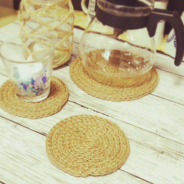 毛糸や麻ひも、ロープなどを使って編んで作るコースターは、あたたかみがあってホットにもアイスにも相性ぴったりです。素朴なあたたかみがある一方で、編み物だから作り出せる豊かな表情で、ディスプレイにもなるようなものばかり。そんなコースターをハンドメイドしたユーザーさんの実例をご紹介します。
