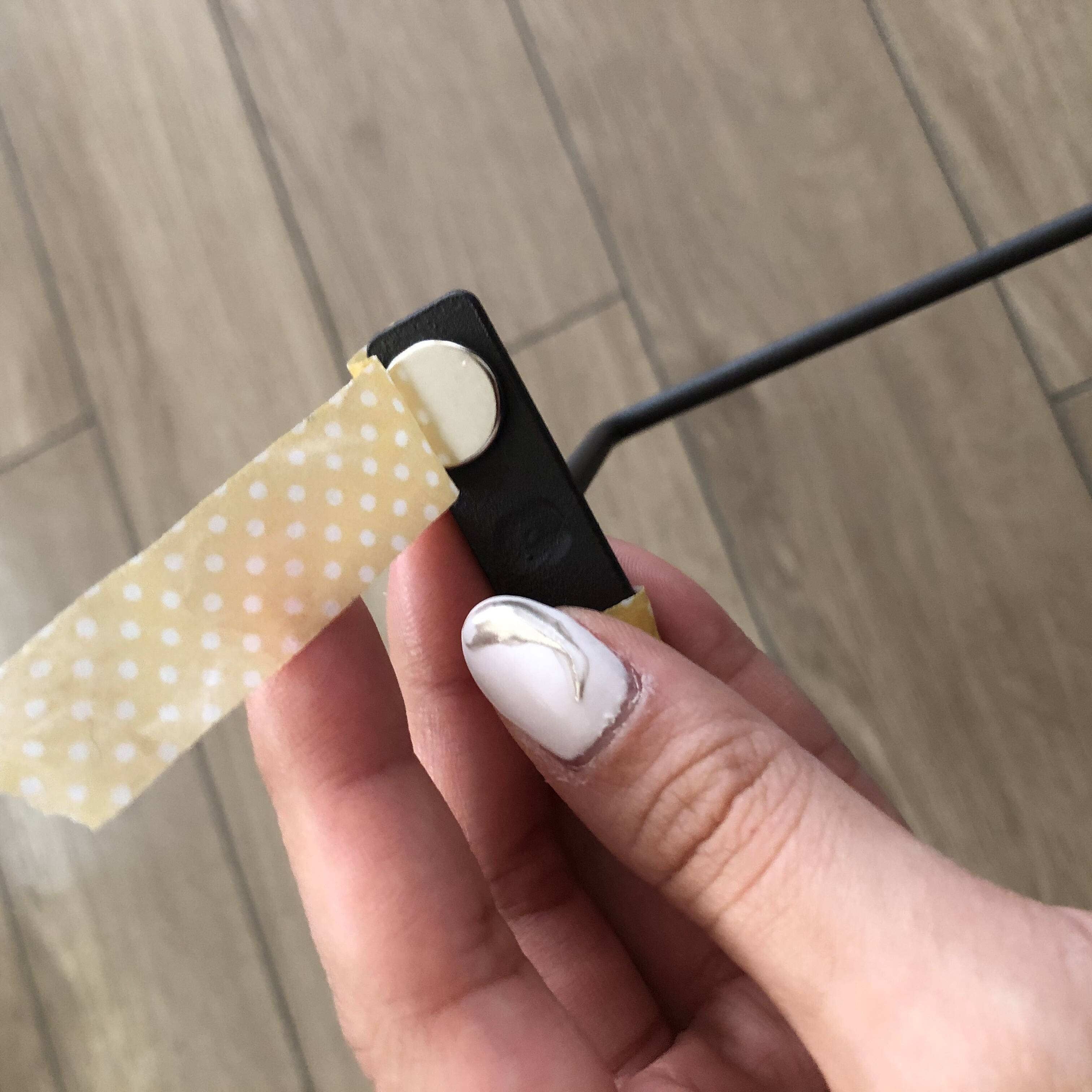 アイアンバーのビスを打ち込む部分に、マスキングテープかセロテープで強力マグネットを貼り付けます。貼り付けなくてもマグネットなのでくっつきますが、テープで巻き付けたほうが、ズレ防止や傷防止になります。
