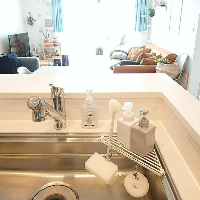 シンクの角にコーナーラックをセットして、スポンジと洗剤の置き場所を作っていました。置くだけでなく、このように挿したり引っ掛けたりできるのも活用の幅が広がりますよね。このラックを使うだけで、ちょっとしたスペースにこれだけのアイテムを清潔に置いておくことができます。