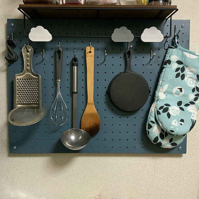 有孔ボードを使って、調理ツール類を引っかけ収納している実例です。実例のようにフックを上下少しずらしてつけると、ツール類の出し入れもしやすそうですね。大人っぽいカラーで塗られており、インテリアのよいアクセントになっています。