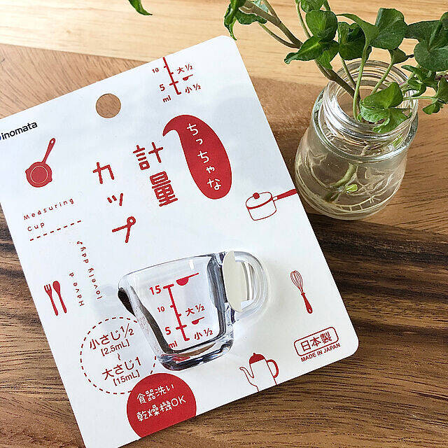 emiさんは、ダイソーでミニサイズの計量カップを見つけられたそうです。これなら、計量スプーンのように大きさを使い分けることなく、簡単に調味料を計ることができます。平面に置くことができるので、液体調味料を入れるのも楽ですね。通常サイズのミニチュアのようなデザインも魅力的です。