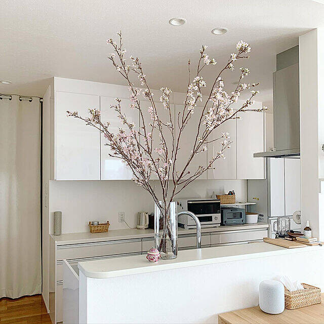 おうちの中で季節の草花を愛でる暮らしは、時間にも気持ちにも余裕を感じられます。こちらのユーザーさんは、キッチンに大胆にも大きな桜の枝を飾って、その色合いや風情を楽しんでいますよ♪春の桜だけでなく季節ごとの草花を飾り、お部屋に彩りと癒しをプラスされているようです。