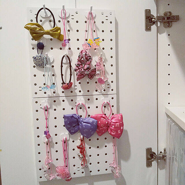 洗面所の扉裏に娘さんのヘアゴムを収納している、こちらのユーザーさん。扉にパンチングボードを取り付け、そこにフックを付けてヘアゴムをかけています。可愛らしいヘアゴムが、とても見やすく収納されていますね。娘さんも扉を開けるたびに楽しんでいるそうです。