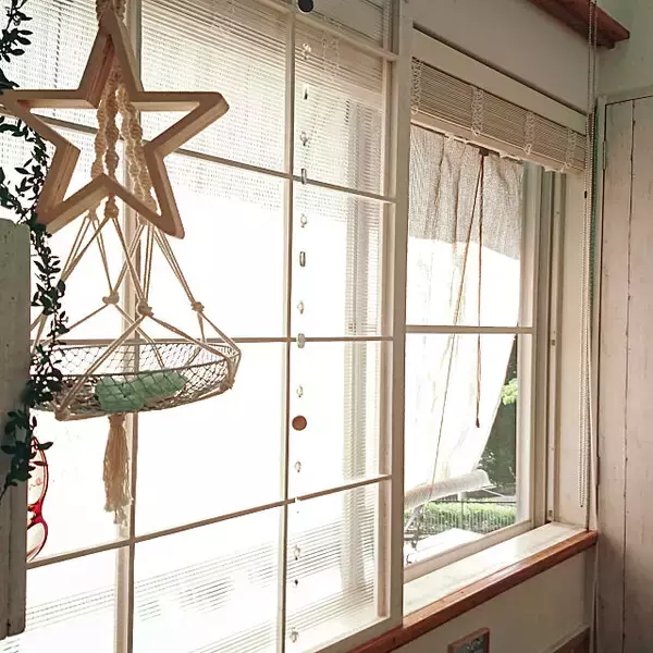 littlejoyさんのキッチン出窓の外側では、見た目も映える西日対策を実践していました。SPF材で作った白い格子を設置し、その内側にはもうひとつSPF材のスライドできる板格子も付けているんだそうです。さらにワイヤープランツを育てつつディスプレイとして彩りも加え、爽やかな窓まわりを実現していました。