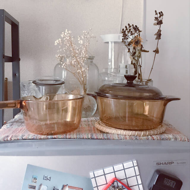 場所をとる調理器具は、機能的で見えるところに置いても絵になるものを選ぶようにしています。こちらのふたつは、中身が透けて見えるのが便利です。また、べっこう飴のようなカラーも気に入っています。