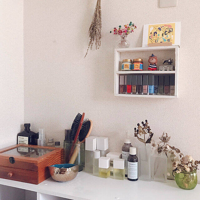 「メイクスペースが欲しくて、リビングスペースからは見えない死角につくってみました。以前使っていた白っぽい収納アイテムを組み合わせただけですが、あるものを活用できてよかったです。」