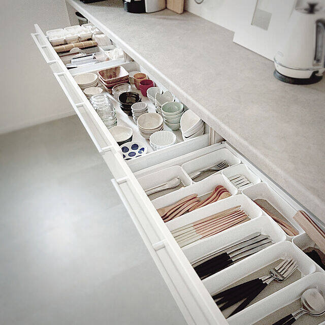 hanaさん宅の美しく整頓されたキッチンの引き出し。すべてのアイテムを見渡すことができて、取り出したいモノがすぐ取り出せる理想の収納です。すっきりと仕切られたカトラリーの収納に使われていたのは、セリアのカトラリーケースでしたよ。まるで備え付けの仕切りのようぴったりです。
