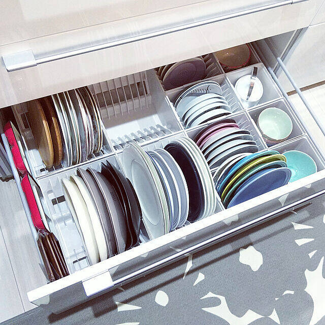 たくさんのお皿が整然と並べられた、キッチン収納の引き出し。ユーザーさんは引き出し用のディッシュスタンドを活用されています。大小のスタンドを上手に組み合わせ、スペースを無駄なく使われていますね。お皿を立てて収納すると、見比べながら選べるのが便利だそうです。