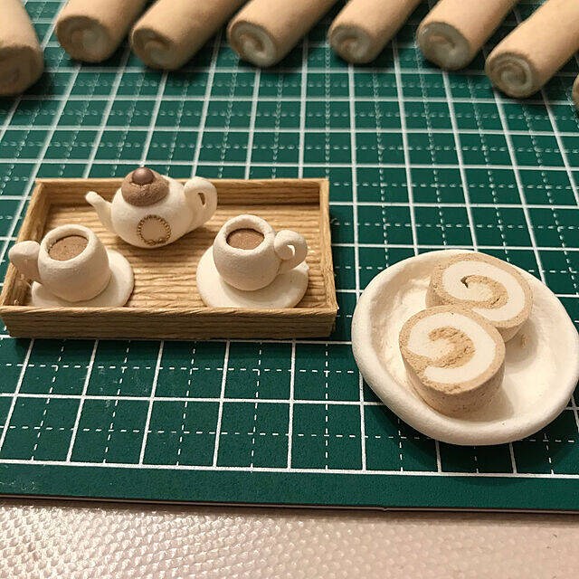rinさんは「木かる粘土」を使って、ミニチュアのロールケーキを作りました。ロールケーキは作ったらすぐにカットするのではなく、2日ほど寝かせるのがポイントだそう。一緒に置いてあるティーセットも、ポットのかざりやカップの取っ手など、ていねいに作られていますね。