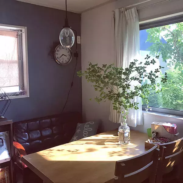 窓の外、そして机の上のグリーンに癒やされるお部屋です。実例のように日当たりのよい場所にテーブルを置けば、屋外気分も味わえそうです。ソファとダイニングチェアという組み合わせも、お店っぽくていいですね。