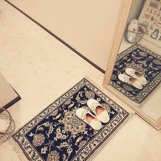 家に帰った瞬間を大切にしているというユーザーさんは、玄関マットとしてペルシャ絨毯を採用しています。シックなカラーの絨毯が、白く美しい玄関のなかで際立って見えますね。お家に帰るのも楽しみになりそうなアイディアです。