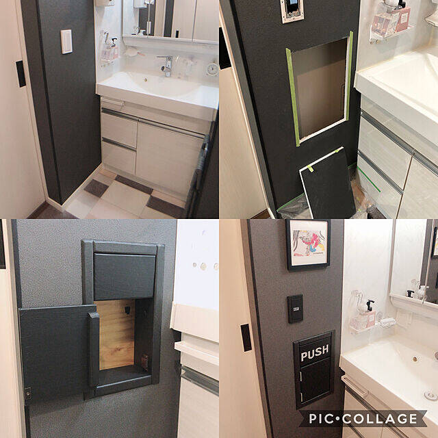 限られた空間の洗面エリアでは、どんなサイズのゴミ箱をどこに置けばいいのか悩んでいる方も多いはず。Kzさんは洗面台のサイドの壁に埋め込み式のゴミ箱をDIYされています。中に引っ掛ける仕組みなので場所も取らず、スマートな雰囲気に。モノトーンの色彩が、洗面所をぐっと引き締めています。