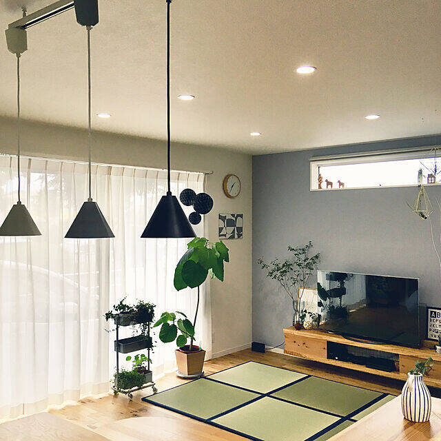 本当は和室が欲しかったとおっしゃるユーザーさんです。テレビ前にラグ感覚で置き畳を敷き、一気に和のテイストの漂うリビングになりました。ペンダントライトとも相性はバッチリ。お子さんたちは、旅館か祖父母の家に来たような気分で大喜びだそう。今ではすっかりなじんで、みんなでゴロゴロしているそうです。
