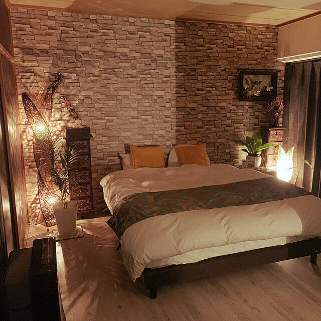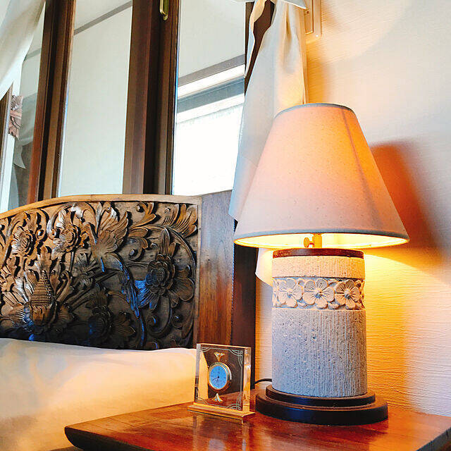 美しい彫刻がほどこされた、木製のベッドと石素材のランプが目を引きます。手仕事の繊細さや、自然素材のあたたかみを存分に味わえるアイテムですね。ユーザーさんいわく、目覚めるとバリ島のヴィラの寝室かと錯覚するほど、雰囲気たっぷりだそうです。