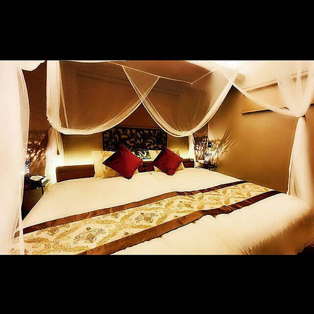 大きなベッドに、ふんわりとかかる涼しげな天蓋。ハイクラスなアジアンリゾートのホテルのような寝室です。ゴールドや赤をアクセントにしたファブリックや、ベッド裏から照らす間接照明の使い方もセンス抜群です。まさに日常を忘れ、ゆったりとした気持ちで過ごせる空間ですね。