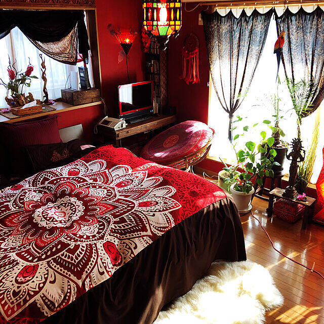アジアンにモロッカンをミックスさせたという、オリジナルテイストの寝室です。目に飛び込んでくるのは、赤いべッドカバーの大きな花模様。アジアンインテリアの力強さを感じますね。エキゾチックでにぎやかな空間ですが、深みのある赤が、コーディネートにまとまりと落ち着きを与えています。