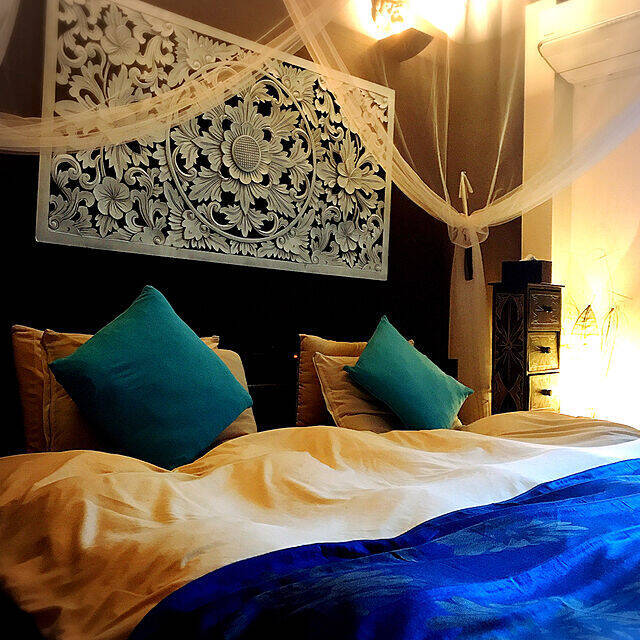 アジアンテイストの寝室を豪華に飾る、大きなウッドレリーフ。ユーザーさんみずから、白く塗装されたそうで、ダークカラーの壁をバッグに、木彫りの柄が美しく浮かび上がります。鮮やかなアクアブルーを使った、ベッドリネンのコーディネートが新鮮ですね。
