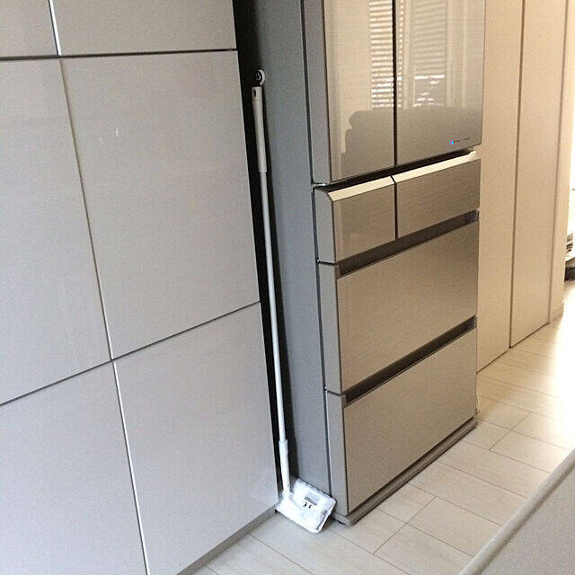 わんちゃんを飼っているというMamiyさん。気になったときにすぐにお掃除ができるようにと、フローリングモップは、冷蔵庫とキャビネットの間のちょっとした隙間を置き場所にしていました。マグネットフックで引っ掛けて収納しています。普段はもっと奥の方に設置して、外から見えないように工夫しているそうです。