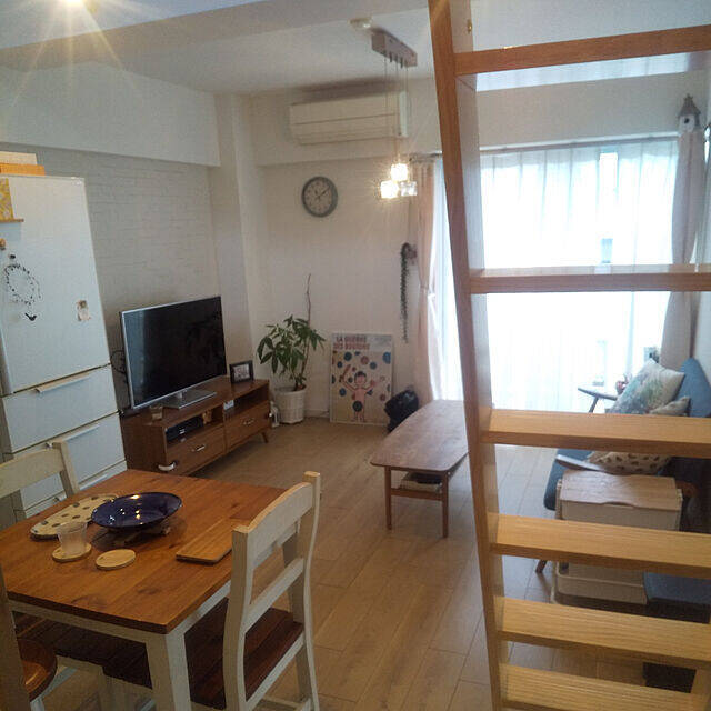 柔らかな光に誘われるようにLDKへ進むと、ご家族の活き活きとした暮らしを感じられる空間が広がっていました。白×木を中心にコーディネートされた、まとまりのあるインテリアが空間の一体感を盛り上げています。ロフトへと続く木製のはしごも、室内階段のようでいい雰囲気です。