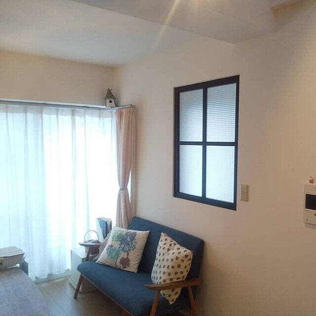 yamamaさんのつくるインテリアのアクセントカラーは、落ち着いたブルーです。リビングでは、ソファにそのカラーが取り入れられていました。無駄のないフォルムと周りのシンプルさが相まって、ソファの色味のもつ味わいが一層際立つように感じます。その上にある、黒枠の室内窓が優し空間に適度なスパイスを利かせ、全体をキュッと引き締めているのも印象的です。