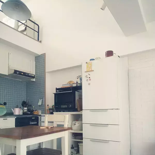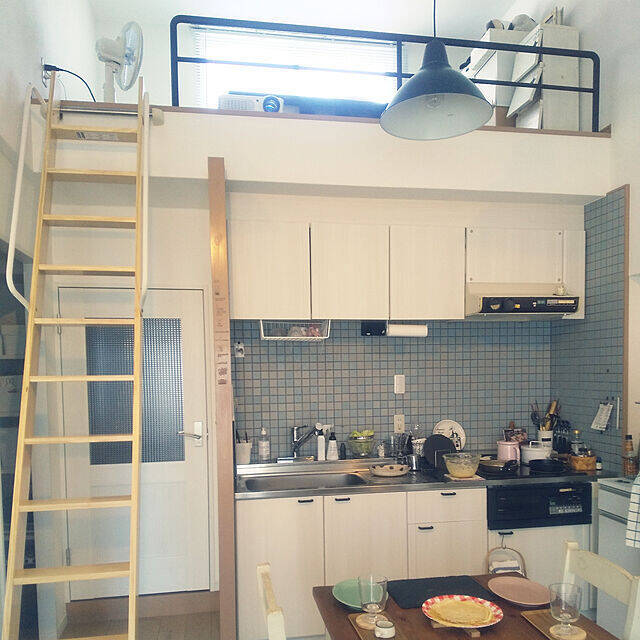 ダイニング・キッチン側も見ていきましょう。ロフトを上に擁するキッチンは、yamamaさん宅のちょうど真ん中でもあります。壁付けI型のキッチンをベースに、壁に沿って家電をL字にレイアウトしているので、小回り抜群なのに広々としています。そして特徴的なブルーのタイルは、インテリアのアクセントカラーをブルーに定めるきっかけでもあるそう。LDK全体がシームレスな空間だからこそ、このタイルの色と質感による明確な変化は、メリハリのあるゾーニングとしても高い効果を発揮しています。