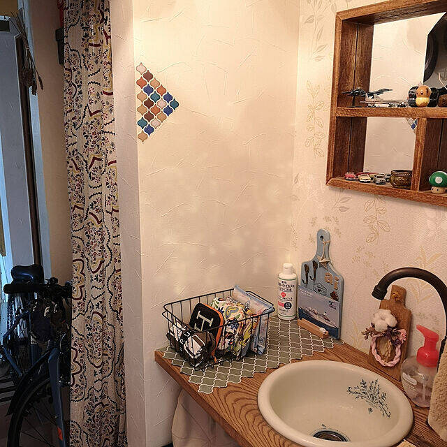 こちらのユーザーさんは、玄関に無印良品のポリプロピレンケースを置き、エコバッグやマスクなどを収納しています。さらに温かい雰囲気にするために、透明なケースにセリアのリメイクシートを貼ったそうです。きちんと仕分けされた収納は使いやすそうですね。リメイクシートの柄もとても優しい雰囲気です。