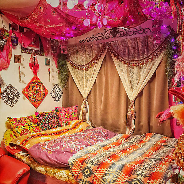 濃いピンク色の壁が魅力的なリビングルームです。棚や壁など細かいところまで丁寧に作り込まれたお部屋は、見ているだけでトリップした気分になれそう。たくさんのカラフルなスワッグが、お部屋の完成度をアップさせていますね。