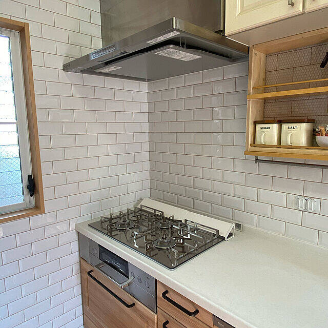 こちらのユーザーさんは、壁にサブウェイタイルを施工されました。真っ白で清潔感抜群なタイルの壁は目地も防汚タイプとのことで、汚れが付着しにくく拭き取りやすいのだそうです。コンロ周りは油汚れが飛びやすい場所なので、このように前面にも側面にもタイルが貼ってあるとよりキレイが保ちやすくなりますね。